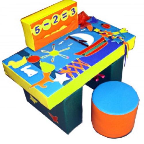 Изделие в виде яркого мягкого разноцветного модуля столика и пуфа с разными обучающими элементами, застежками, шнуровками, липучками, аппликациями для дидактики. Размер стола 80х45х45 см, пуфа 30 см.