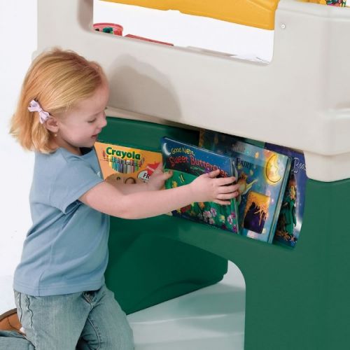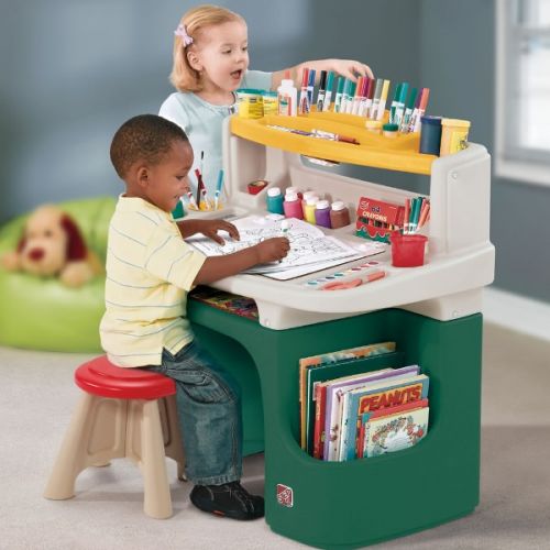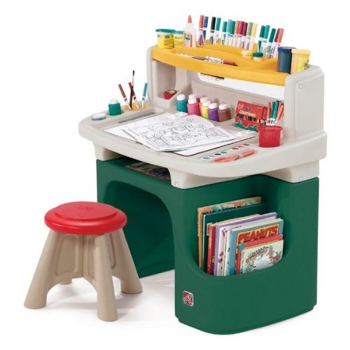 Изделие в виде комплекта стола и стульчика. С широкой столешницей с отделениями, яркой полочкой, лампой, боковыми ящиками, задней полкой. Столик легко чистить.