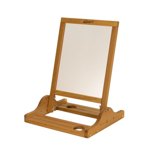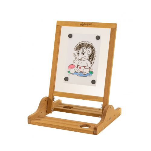 Полочки-подставки имеют отверстия-подстаканники, в которых удобно разместить стакана-непроливайки. Рабочая поверхность мольберта это прозрачный акрил. Угол наклона поверхности регулируется с помощью винтов и гаек типа «бабочка».
