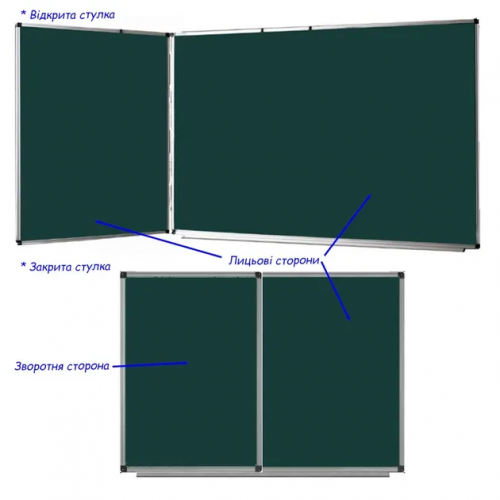 Доска имеет три магнитные поверхности: основную и двухстороннюю поворотную створку, которую можно разместить слева или справа.