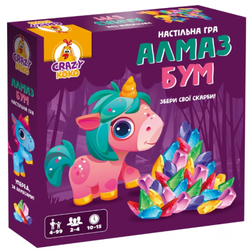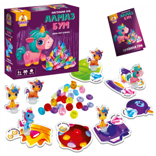 Собирай алмазы в волшебной стране единорожок! Настольная игра для всей семьи, которая перенесет вас в мир облаков, вкусностей и сияющих сокровищ. Выбирайте свою единорожку, бросайте кубик и соревнуйтесь за алмазы. Игра рассчитана на 2-4 игрока в возрасте от 4 до 99 лет. Волшебное приключение ждет!