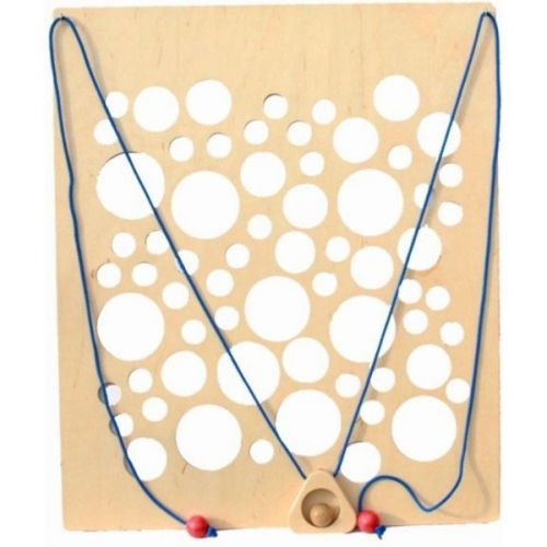 Изделие в виде яркой деревянной панели. С круглыми сквозными прорезями разного размера, треугольником с шариком на шнурке.