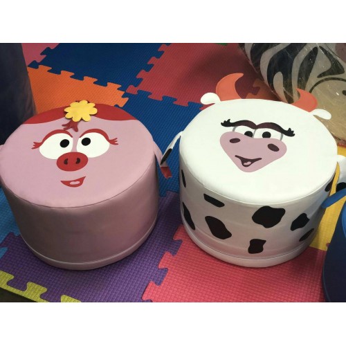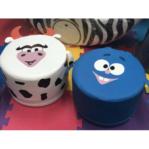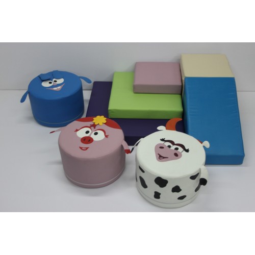 Изделие в виде яркого мягкого модульного набора с рисунком. Изделие состоит из горки, 3 пуфиков смешариков, куба, 3 матов. Размер пуфа 45х30 см. Модель яркая, мягкая и легкая.
