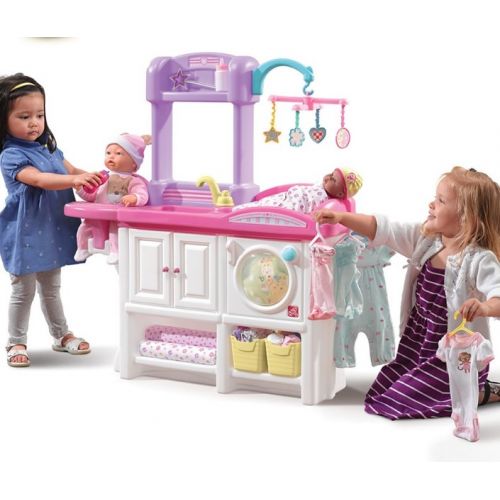 Изделие в виде столика для кукол. С пеленальным местом, стульчиком для кормления, комодом, стиральной машинкой, мобилем, раковиной, 2 корзинами для хранения, 3 вешалками для кукольной одежды.