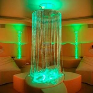 Световая конструкция, изготовленная по типу люстры, декорированная 150-тью оптическими волокнами. На концах с целью исключения распутывания закреплены пластиковые колпачки. Изделие излучает мягкий, спокойный свет нескольких оттенков. Тактильный и световой контакт с изделием оказывает релаксационное воздействие. Оказывает терапевтическое воздействие на нервную систему, успокаивает, расслабляет.