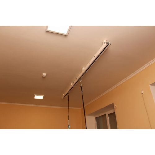 Состоит из трех креплений. Два крепления регулируется по высоте. Объект крепится в пределенном месте на каждом креплении. Можно передвигать подвешенный объект по всей длине системы.