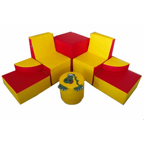 Изделие в виде яркого мягкого набора мебели из 8 элементов: куба, диванов, матов, пуфиков. Размер куба 50х50х50 см, дивана 30х60х40 см, мата 30х40х10 см, пуфа четвертинки 50х40х20 см, пуфа котика 30х30 см. Размер изделия 150х150х60 см.