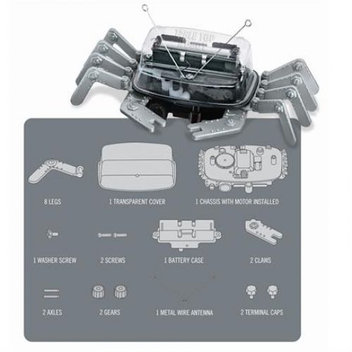 Набор состоит из прозрачной крышки, шасси с мотором, 8 ножек, 2 клешней, отсека для батареи, винта с шайбой, 2 винтов, металлической антенны, 2 колпачков-зажимов, 2 осей, 2 передач, инструкции. Батарейка в комплект не входит. Набор развивает логику, воображение, память, творчество, мышление.