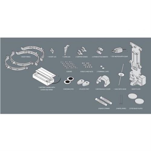 Набор состоит из 4 ободов для корпуса, короткой лапки, длинной лапки, 2 рук-клешней, держателя для соломинок, игрушечного мотора с шестерней, 4 болтов с гайкой, 2 колпачков зажима, отсека для батареи, 2 зрачков, 2 основ для глаз, 2 пластиковых ног, крышки для мотора, оси с зубчатым колесом, панели корпуса, 2 гибких соломинок, 2 проволок, инструкции. В комплект банка и батарейки не входят. Набор развивает логику, воображение, память, творчество, мышление.