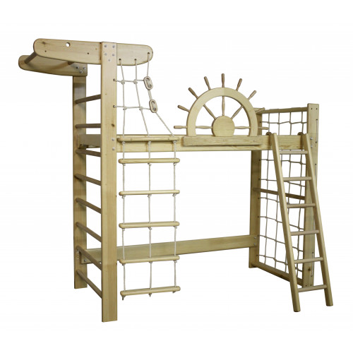спальное место – 190х80 см внешние габариты кровати - 250х94 см шведская стенка (выс) – 210 см гладиаторская сетка (выс) – 160 см вынос турника на внешнюю сторону - 45 см бортик "штурвал" верхнего яруса (шир/выс) - 68х62 см расстояние от пола до спального места - 144 см ширина лесенки - 40 см |