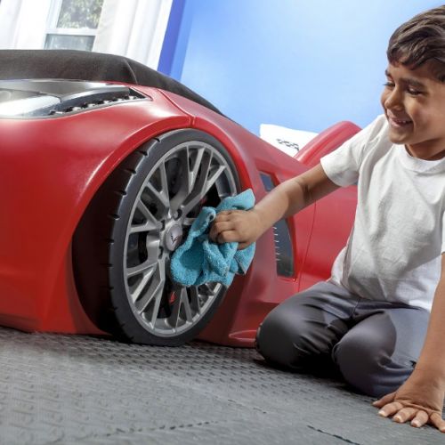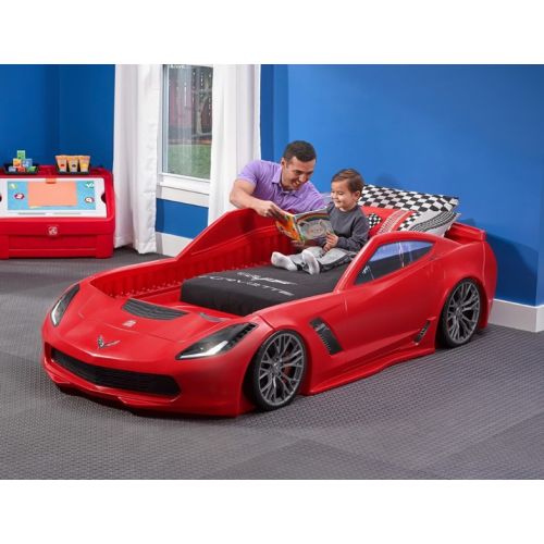 Изделие в виде спортивного автомобиля красного цвета. С матрассом, реалистическим корпусом и надписями марки Corvette, ночником в виде фары, встроенной гоночной трассой для игры.