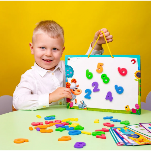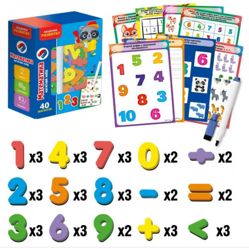 Развивайте логику, память и мелкую моторику малыша с мягкими магнитами. Учите цифры, решайте задачи на многократных карточках и наслаждайтесь обучением вместе. Идеально для детей 4-7 лет! Набор: 40 магнитов, 6 карт, маркер.
