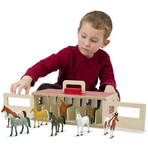 Изделие в виде яркого набора из 8 лошадок разных пород и деревянной конюшни. Конюшня с ручкой для переноски и открывающимися дверьми. Игрушку можно взять с собой в дорогу.