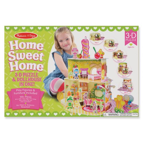 С этим потрясающим набором 3D пазлов, следуя инструкции, можно собрать многоуровневый домик со сладостями высотой около 38 см, без клея и ножниц. В комплект входит более 100 деталей, которые сделаны из пенного материала: мебель, аксессуары, куклы, сладости.