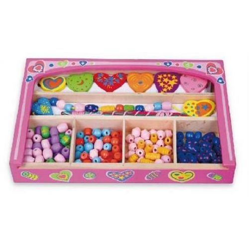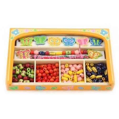 Изделие представлено набором из 180 разноцветных бусинок, 8 фигурок и 5 шнурков для нанизывания. С деревянной коробкой.