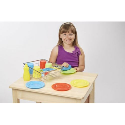Этот прочный игровой набор состоит из 4 разноцветных пластиковых тарелок, 4 стаканчиков, 4 пластиковых вилок, ложек, ножей, пластиковой бутылки моющего средства, губки, металлической сушилки, отсека для ложек. Этот набор порадует юных хозяек.