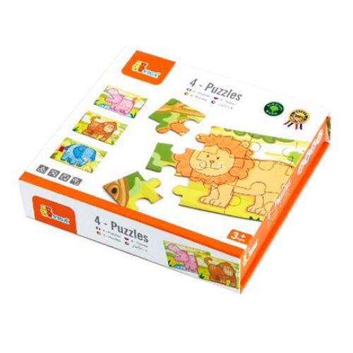 Изделие в виде яркого набора из 48 пазлов животных джунглей для создания 4 картинок. Игра развивает мелкую моторику, логику, воображение, память, мышление.