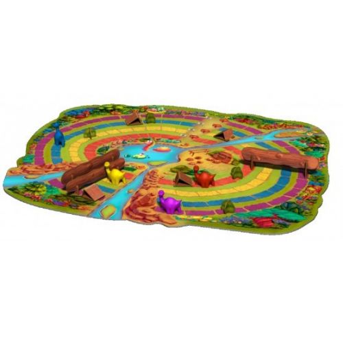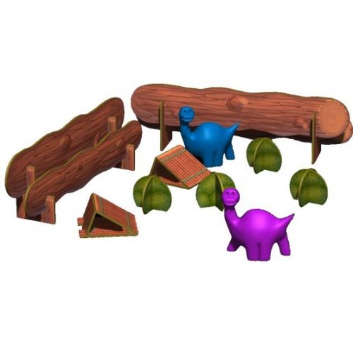 В наборе: игровое поле, 4 динозаврика, 4 сборных трамплина, 6 сборных 3D- препятствий, кубик, правила.