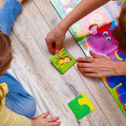 На пазлах нарисованы различные животные, которые помогут ребенку изучить понятие часть и целое.