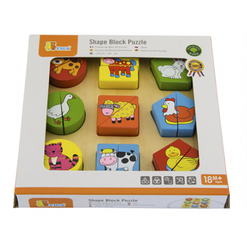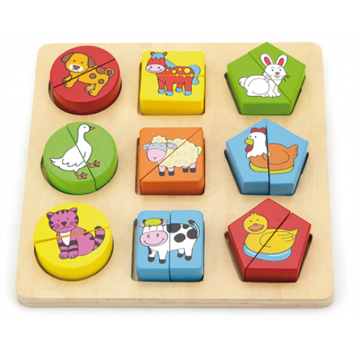 Изделие представлено ярким набором из 18 цветных геометрических блоков-пазлов с изображениями разных животных. Пазлы разделены на две части. С деревянной рамкой.