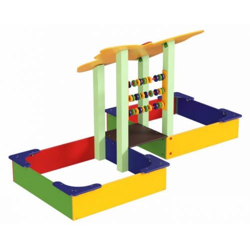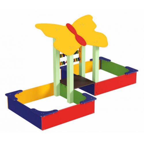 Изделие в виде уличной открытой двойной песочницы. С оригинальным дизайном, яркими красками, навесом с бабочкой, 6 скамейками, счетами. Для детей от 2 лет.