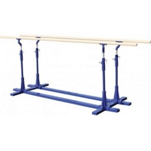 Изделие в виде гимнастических брусьев для мужчин. С металлической рамой, 4 стойками с фиксацией высоты, 2 деревянными жердями, 4 вертлюгами для регулирования расстояния между жердями.
