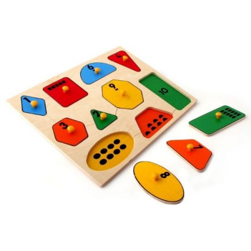 Изделие в виде яркого набора из рамки-планшета и 6 пазлов разных геометрических фигур с цифрами. С ручками. Игра развивает мелкую моторику, мышление, логику, воображение, внимание.