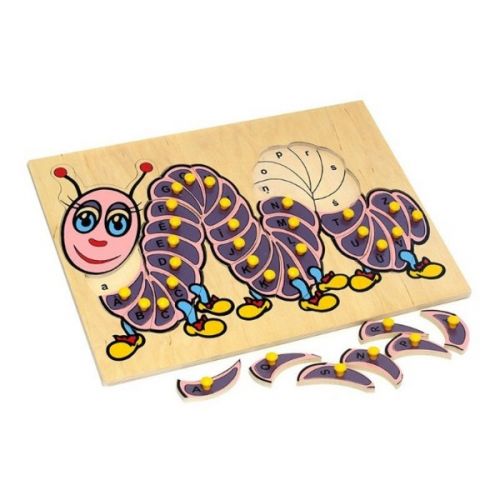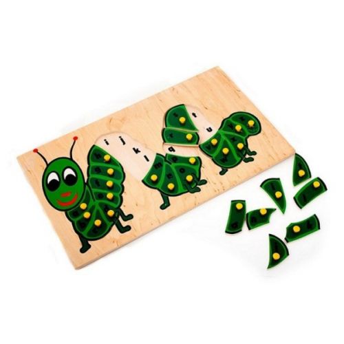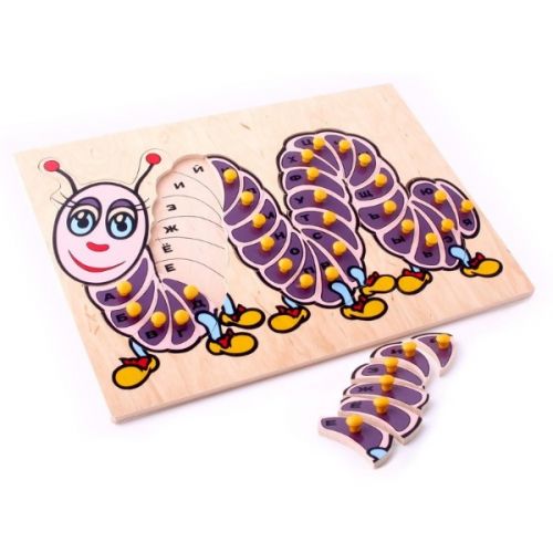 Изделие в виде яркого набора из панели с гусеницей и английскими буквами и 26 пазлов деталей. С ручками. Игра развивает мелкую моторику, мышление, логику, воображение, внимание.