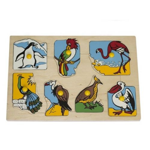 Изделие в виде набора из рамки-основы и 7 элементов-пазлов экзотических птиц. С ручками-кнопками. Игра развивает мелкую моторику, внимание, логику, воображение, творчество.