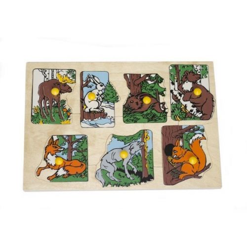 Изделие в виде набора из рамки-основы и 7 элементов-пазлов лесных животных. С ручками-кнопками. Игра развивает мелкую моторику, внимание, логику, воображение, творчество.