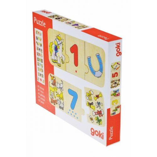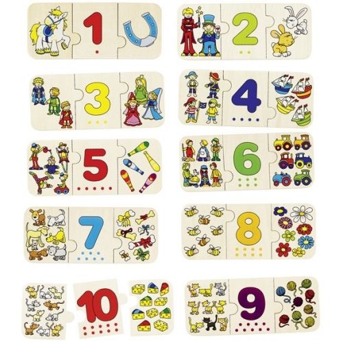 Развивающая и веселая игра «Узнай количество» немецкого производителя игрушек goki. Это замечательные пазлы для детей, которые только учатся считать. Суть игры - подобрать к цифре картинку с соответствующим количеством нарисованных предметов на ней. В набор входит 10 цифр с дополнительными пазлами-ассоциациями. Правильный вариант тот, в котором правильно составленная комбинация пазлов. Части игрушки «Узнай количество» сделаны из натурального дерева, покрытого яркими красками на водной основе и приятное на ощупь.