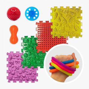 Набор состоит из 4 ортопедических пазлов, 1 двойного массажного мяча, 5 сенсорных резинок для мелкой моторики, 1 круглого массажного мяча и 1 силиконового эспандера. |