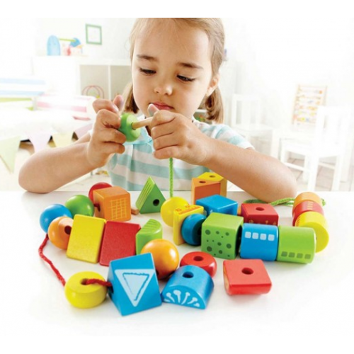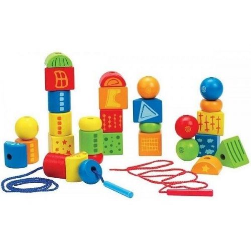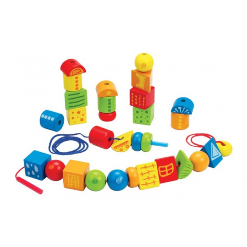 Яркая модель представлена набором геометрических фигурок различной формы и шнуровки для нанизывания.