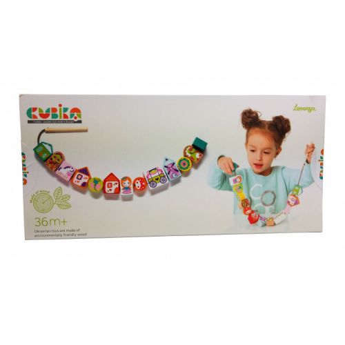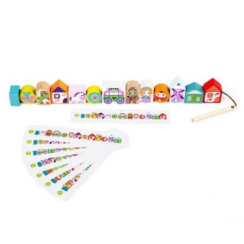 Изделие в виде яркого набора из разноцветных деталей с разными рисунками с отверстиями и шнуровки для нанизывания. Игра развивает мелкую моторику, воображение, внимание.