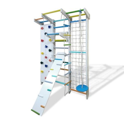 В комплекте: шведская стенка, турник, веревочная лесенка, кольца, канат, диск, детский переставной турник, доска, панель скалодрома, зацепы пластик - 12шт, гладиаторская сетка, крепеж.