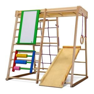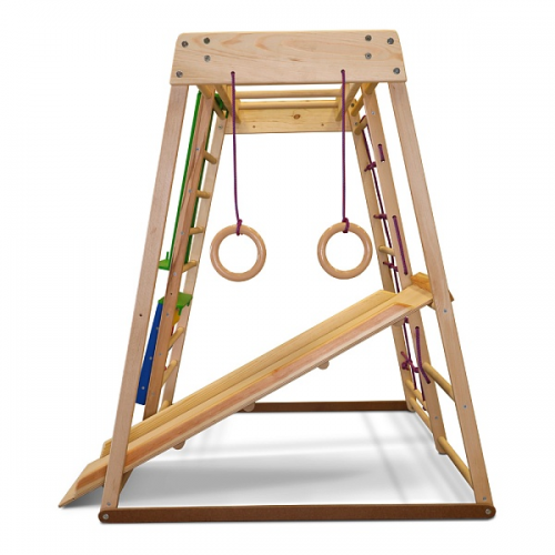 Занимаясь на таком спортивном уголке, ребенок тренирует все группы мышц, получает норму ежедневной физической нагрузки, развивает творческие способности, изучает основы математики и оздоравливается в целом. Также модель способствует профилактике заболеваний центральной нервной системы и развитию вестибулярного аппарата.