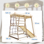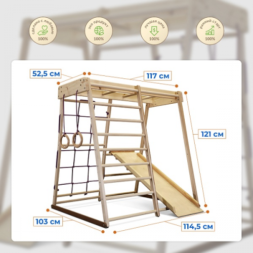 Занимаясь на таком спортивном уголке, ребенок тренирует все группы мышц, получает норму ежедневной физической нагрузки и оздоравливается в целом. Также модель способствует профилактике заболеваний центральной нервной системы и развитию вестибулярного аппарата.