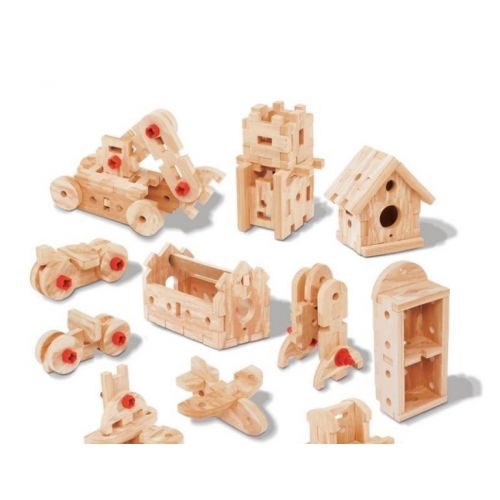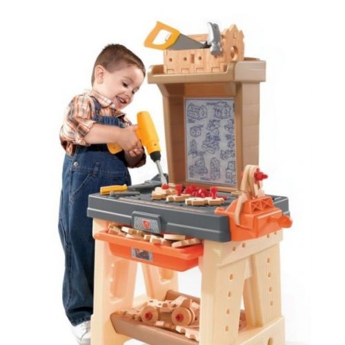 Изделие в виде яркого стола с полками для мастера. Детали похожие на дерево. В комплекте 65 аксессуаров, строительные инструменты. Изделие легко и быстро собираеться.