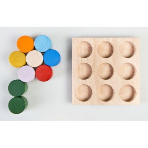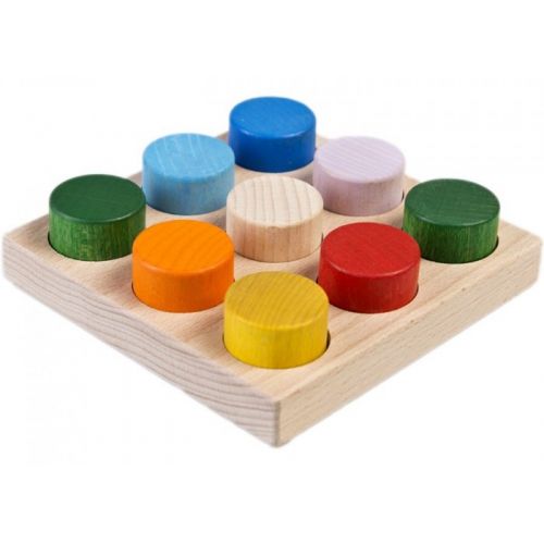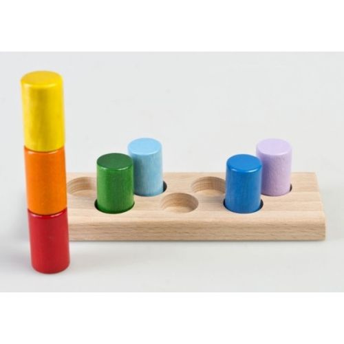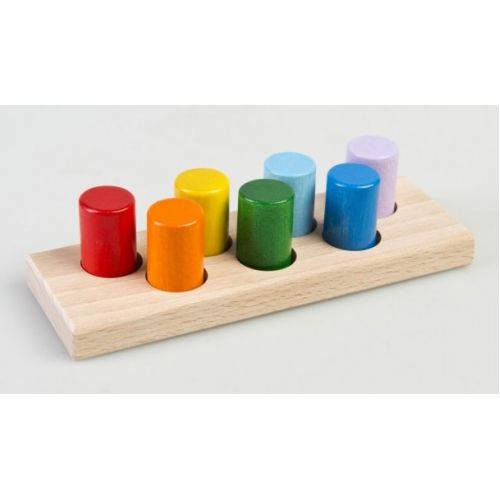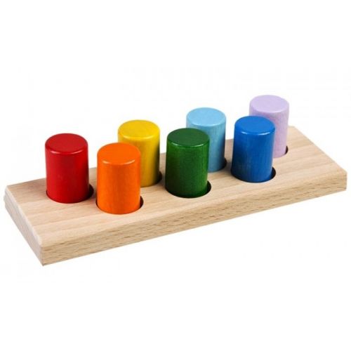 Изделие с основанием, 7 разноцветными цилиндрами и 7 углублениями. С крупными округленными деталями. Ребенок может играть, учить цвета и формы.