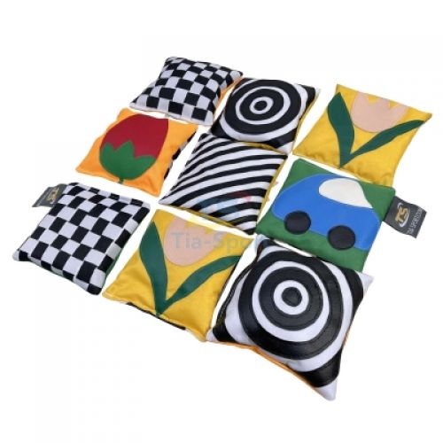 Три режима соответствия: визуальная лицевая сторона (цветная), визуальная задняя сторона (черно-белая), начинка (разная тактильная). Каждый элемент выполнен в двух экземплярах, нужно найти пару к каждому элементу.