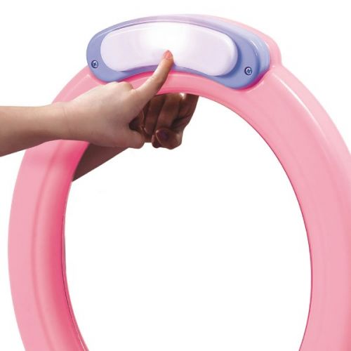 Изделие в виде столика для девочки. С пластиковым зеркалом, подсветкой, литым органайзером для принадлежностей, выдвижным ящиком для хранения вещей, стульчиком. В наборе ручное зеркальце, гребень, щетка для волос.