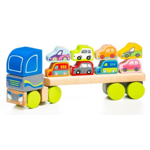Изделие в виде набора конструктора тягача и 8 маленьких машинок. Все элементы разноцветные и гладко обработаны.