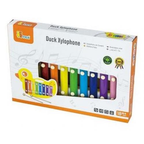 Изделие в виде яркого ксилофона в форме уточки. С цветными металлическими пластинами и приятными звуками.
