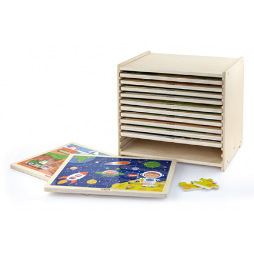 Изделие представлено набором из деревянной стойки и 12 пазлов на тематику космоса. С рамками и рисунками-подсказками.
