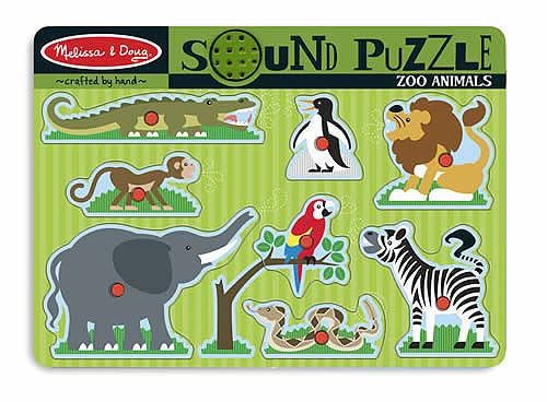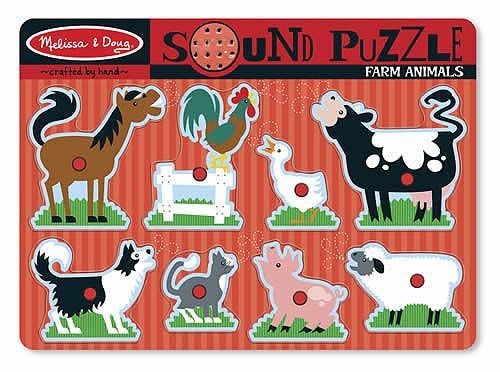 Звуковой пазл сам поможет собрать его правильно. Достаточно верно разместить элемент на свое место и прослушать звук. А удобные ручки элементов не только облегчат установку и снятие элементов с ячеек но и способствуют развитию моторики ручек ребенка. Размер пазла 22х30 см. Пазл состоит из игрового поля и 8 элементов.