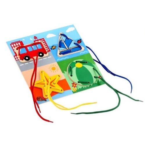 Виріб у вигляді набору з різнобарвної основи з 4 різними видами, 4 накладних частин з автобусом, корабликом, зірочкою, м'ячиком і 4 шнурівок. Гра розвиває дрібну моторику, логіку, уяву, творчість.