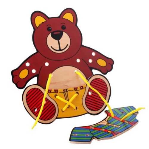 Виріб у вигляді набору з основи у вигляді ведмедика, 2 накладних частин одягу, шнурівки. Гра розвиває дрібну моторику, логіку, уяву, творчість.
