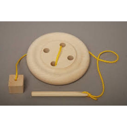 Діти дуже люблять відчувати себе дорослими. А ніщо так не робить дитину дорослою, як "справжня" доросла річ і "доросле" заняття. Давайте ж займемося сьогодні господарством - "приший" гудзик. А щоб маленькі незграбні пальчики впоралися з цим мудрованим завданням, то гудзик буде великий і з великими дірочками, голка - дерев'яною, а замість нитки - яскрава шнурівка. Покажіть малюкові швейні рухи - голка пірнає в дірочку і виринає назад, причому відразу зверніть його увагу, що виринати вона повинна не довільно, не через край гудзика, а в сусідню дірочку або дірочку по діагоналі. Поки дитина маленька, це стане відмінним тренажером для освоєння навичок шнурівки, допоможе розвинути моторику, окомір, посидючість. Іграшка виготовлена ​​з екологічно чистої деревини.