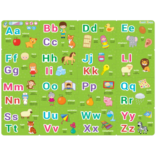 Виріб у вигляді барвистого інтерактивного пазла зі звуком для вивчення англійської мови. Складається з 16 деталей. З аудіо відтворенням малюнків англійською, українською, російською мовами. Рекомендується використовувати з Розумною Ручкою.