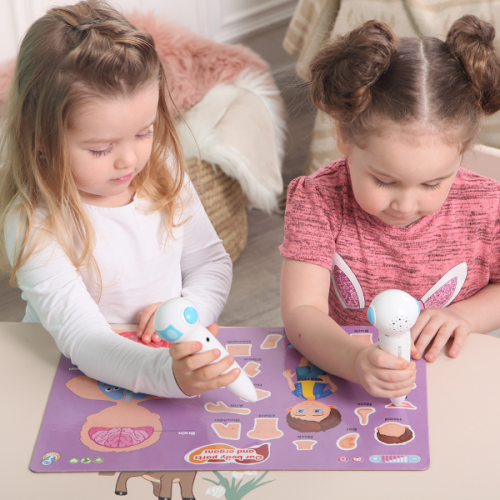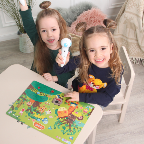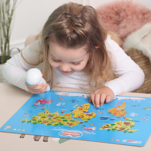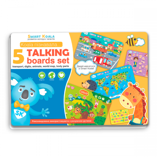 Виріб у вигляді набору з 5 барвистих інтерактивних бордів Транспорт, Цифри, Тварини, Карта світу, Частини тіла для вивчення різного виду транспорту, цифр, тварин, частин тіла, карти світу. Кожен борд з озвученням українською, англійською, російською мовами, короткими діалогами, перекладами, 10 іграми. Рекомендується використовувати Розумну Ручку.